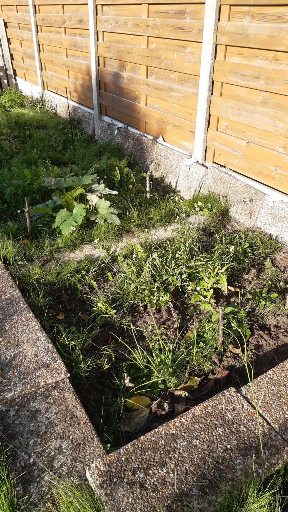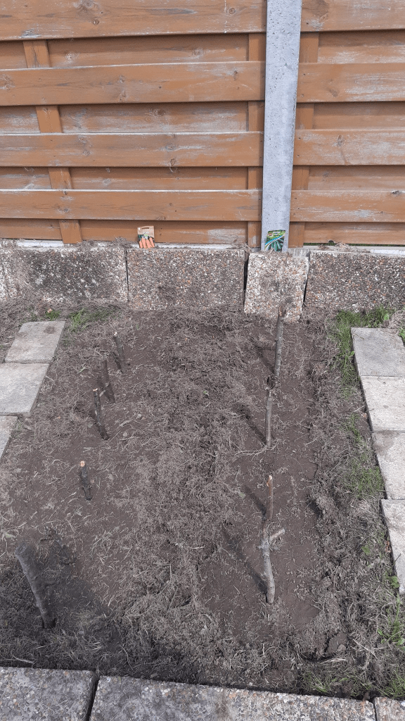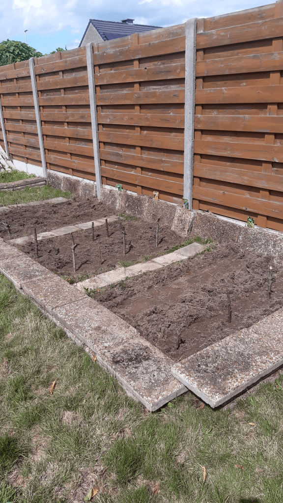 I had some old pavement stones lying on the side from an old path I had broken up earlier (in 2022.. or that same year.. I can’t remember) and decided to put them to good use. The first iteration of the growing beds was being created by laying these stones as pictured below and asking a good friend of mine (Jimmy) if he could help me out till the soil (he had an electric cultivator and the soil was too hard to do so with a spade). With help of Jimmy and his cultivator, we loosened up the first 10 cm of the top soil.