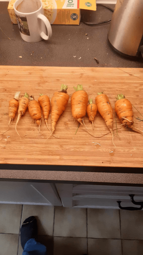 Carrots were harvested. Ginger sprouts remained (but would wither and die in early 2024 due to a mild winter). Garlic would continue growing throughout winter and during spring 2024.