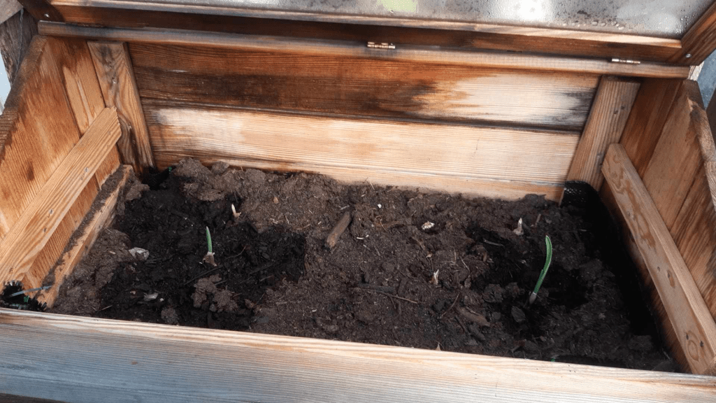 As my green thumb was developing and took real pride and enjoyment in growing things, I read up on plants which needed cold and freeze. I learned that Garlic is typically planted mid-October and needs cold winters in order to have some nice bulbs. So I bought some garlic from the local shop (ALDI) and planted them in a designated tray I built.