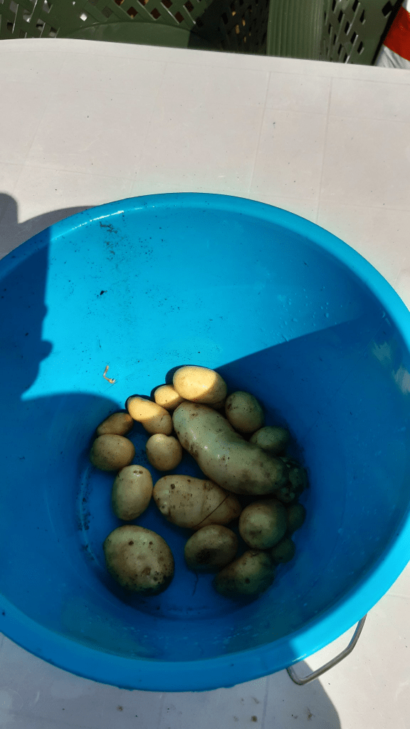 A result of rotten potatoes I had thrown away earlier that year and during the building of the vegetable garden had pushed in some loose fertile ground near the patches. It was a coin toss as to what would happen but I was in luck.