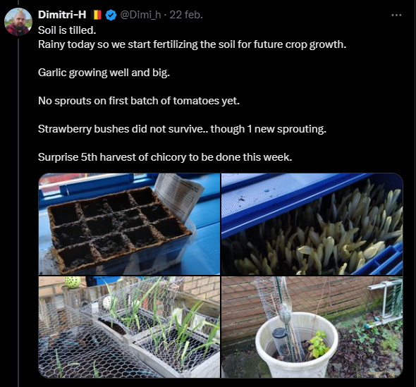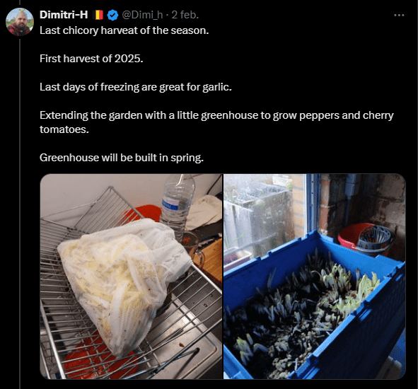 The chicory was pushing through AGAIN. Eventually, between January up to 1st of March did I have about 2 harvests in total. Harvests were used in preparing soup, Chicory hamrolls in cheesesauce (Belgian delicacy) and a greater part frozen for later consumption.